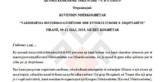 Pasi kemi pasqyruar sugjerimet e ardhura, sot ndodhemi nënjëgatitje të mbarëpër fillimin e një nisme që me plotgojë, sëbashku mund të themi na qoftë udha e mbarë. Një grup Shoqatash në Tiranë dhe një grup jo i vogël individësh, kanë menduar të organizojnë një Kongres Ndërkombëtar (Kuvend Ndërkombëtar), mbi vlerat e shqipes dhe shqiptarëve në mijëvjeçarë. Mbas shumë diskutimesh kemi arritur të përpilojmë njëmaterial njoftues, me qëllimin dhe objektivat përkatëse. Pikërisht, këtë po ju sjellim si fillim, ku do të donim shumë: